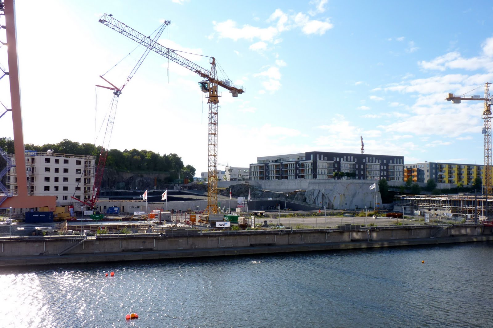 Här i Eriksberg fortsätter husbyggnationerna. Just nu pågår fyra byggen, varav tre ligger tvärsöver dockan från oss räknat. Det verkar som om man numera bygger flera små lägenheter - i det 14-våningshus som är under byggnation kommer det att finans två - och trerumslägenheter. De största är treor med en yta på 75 lvm (och vi tycker ibland att vår lägenhet är lite liten, och den är på 104...)